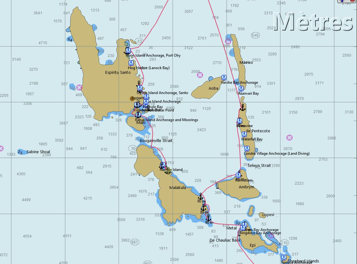 Joli mouillage au nom bien français. Un bassin derrière une barrière de corail et des tortues. Nous sommes à 5 nautiques de Luganville que nous avons quitté sous la grisaille, accompagnés d’un petit crachin. Trouver le contre-courant pour ne pas consommer trop de gazole. Et nous arrivons sous le soleil dans le bassin. Un Resort devant nous et bientôt des tortues, difficiles à prendre en photo. Nous les entendons souffler dès qu’elles mettent la tête hors de l’eau, le temps d’ajuster l’objectif, il n’y a plus que des cercles à la surface, elles ont déjà plongé.