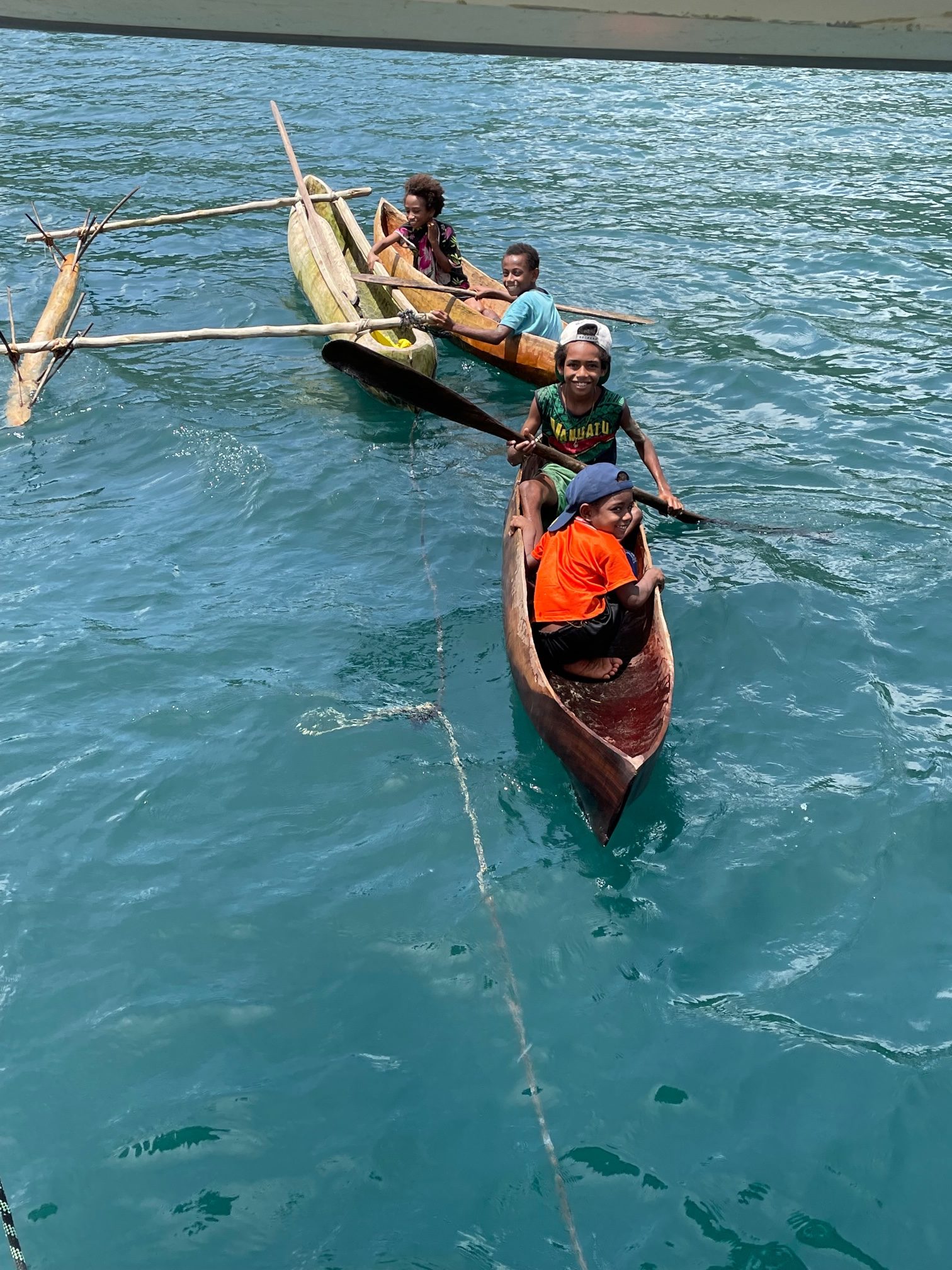 Quel accueil ! Nous les laissons nous conseiller pour le mouillage, nous espérons surtout qu’il n’y aura pas de grains trop violents ici, car cela peut se révéler un piège. John, un des 7 chefs, reste bavarder avec nous, les garçons se sont vite carapatés après avoir reçu des bonbons. Un autre chef, Fréderic nous rejoint avec un ananas, cadeau de son épouse Cynthia. Un autre adulte, Atkinson reste en retrait.