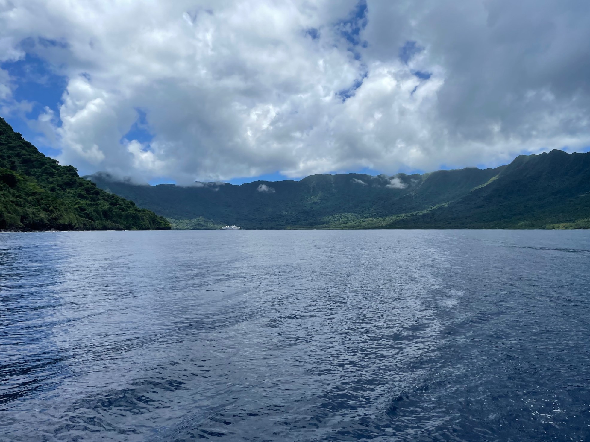 Nous savons qu’un paquebot est attendu pour le lendemain et sommes revenus exprès pour voir les danses prévues pour les touristes. À 7 heures, le Soleal, petit paquebot de la Compagnie du Ponant, mouille dans la baie.