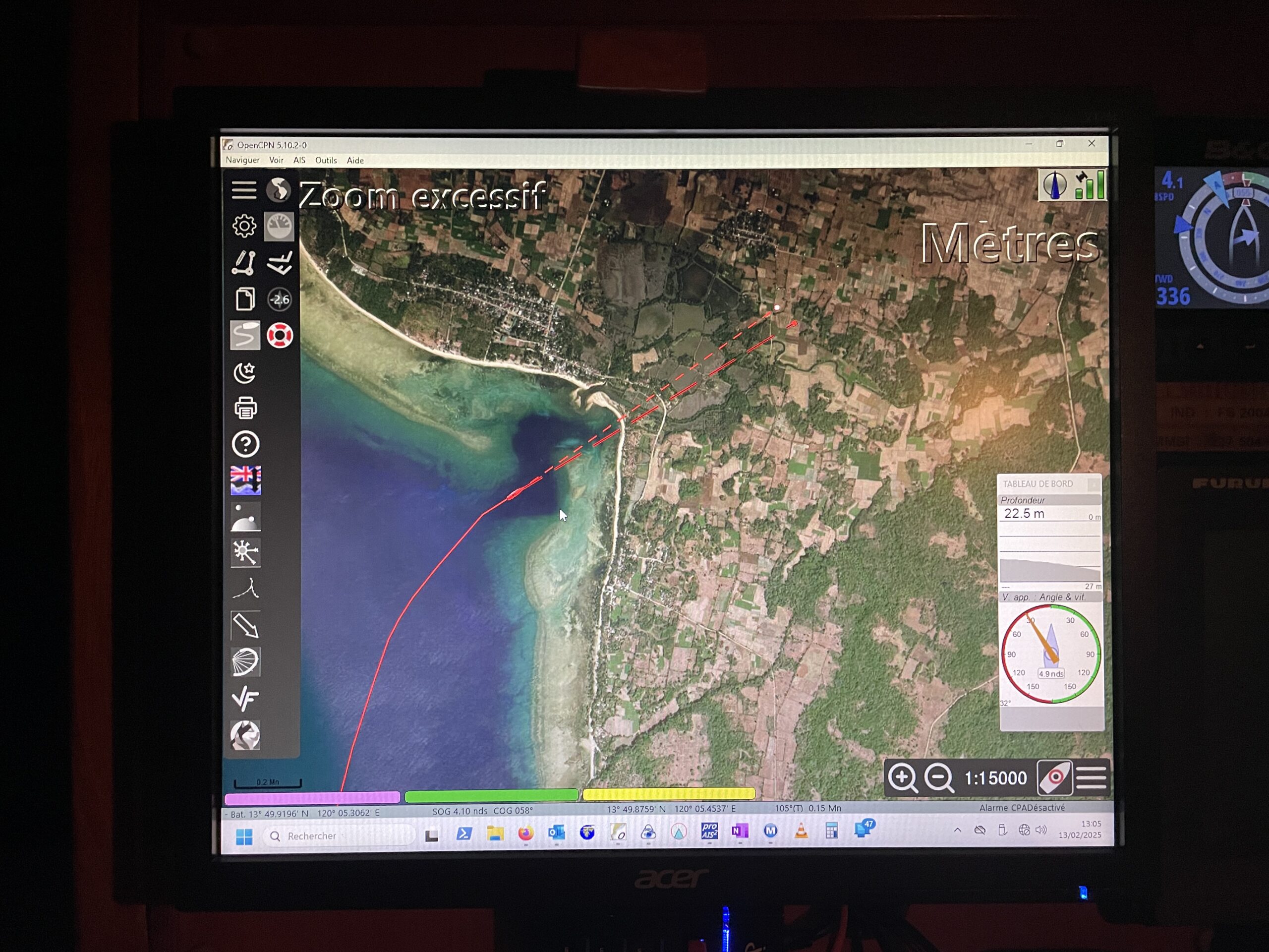 Deuxième mouillage de nuit à l’entrée de Subic Bay. Port Binanga. Un ralentissement soudain de notre vitesse, que se passe-t-il ? Avons-nous pris quelque chose dans l’hélice ? La dérive ne remonte plus, quelque chose coince. Par le puits de dérive, Eric aperçoit une chaussure coincée à l’intérieur. Pourvu qu’il n’y ait pas la jambe du propriétaire dans la chaussure.