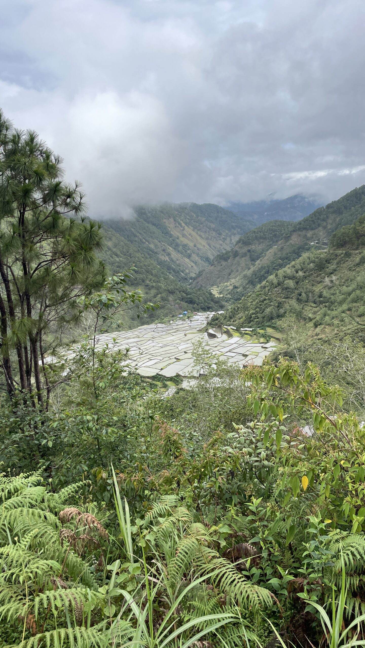 Bontoc n’est pas une jolie ville, toute en béton accrochée aux collines. Un empilement de petits immeubles gris sur pilotis. Nous sommes dimanche, la rue principale est très animée, il est 8 h du matin les citoyens vont à l’église. Les boutiques sont ouvertes, la viande et les boyaux déjà exposés à la vente. Impossible de se garer pour prendre un café, tous les trikes sont au repos et nous avons du mal à croiser les voitures en sens inverse. On reprend notre montée. Nous désirons voir les fameuses rizières de Batad. Un petit crachin nous accompagne et il est difficile de profiter du paysage.