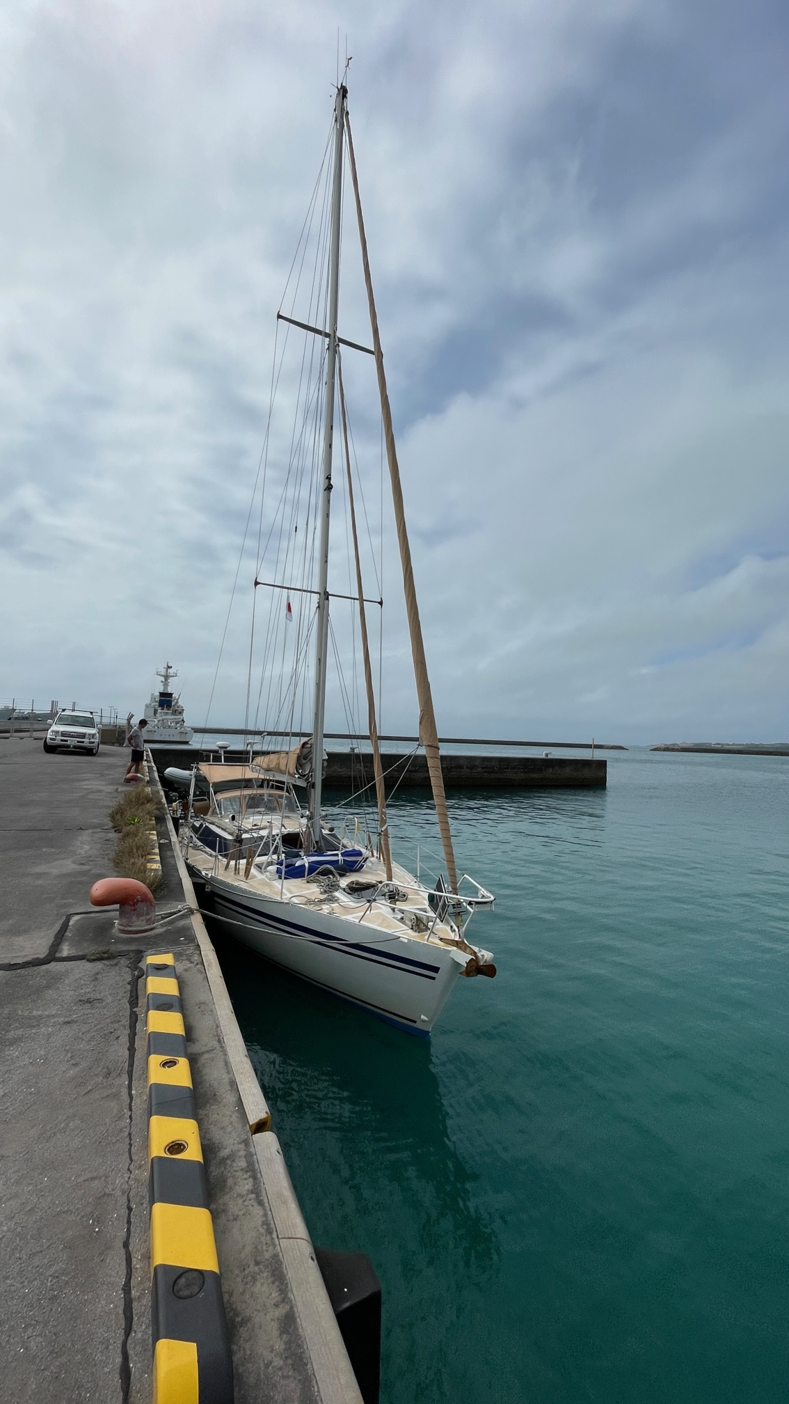 Et tout ce petit monde a fait tête à Ishigaki, sur l’île d’Ishigaki, province d’Okinawa. Premier stop non prévu initialement mais impératif vu le coup de vent qui s’annonçait. Nous avions annoncé arriver à 12h à quai, nous y étions à midi pétantes.