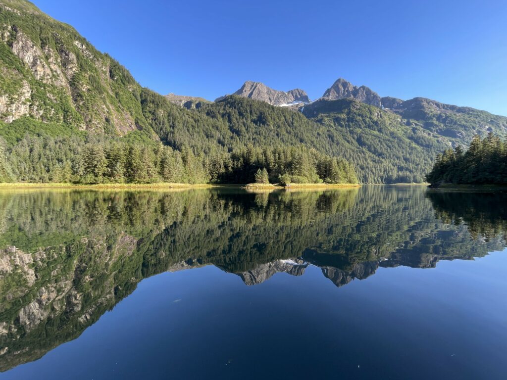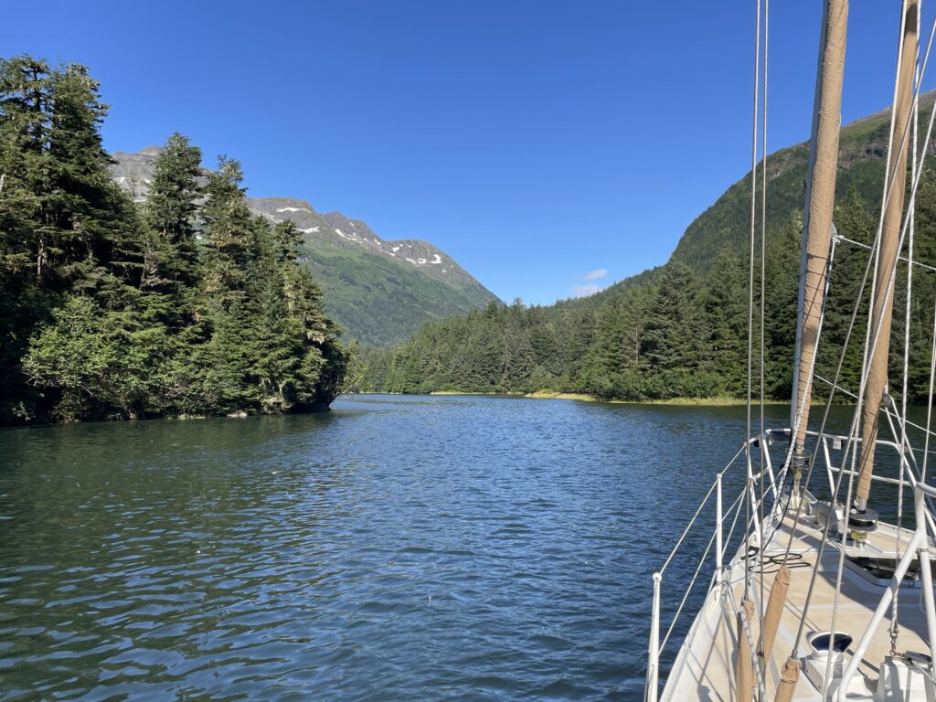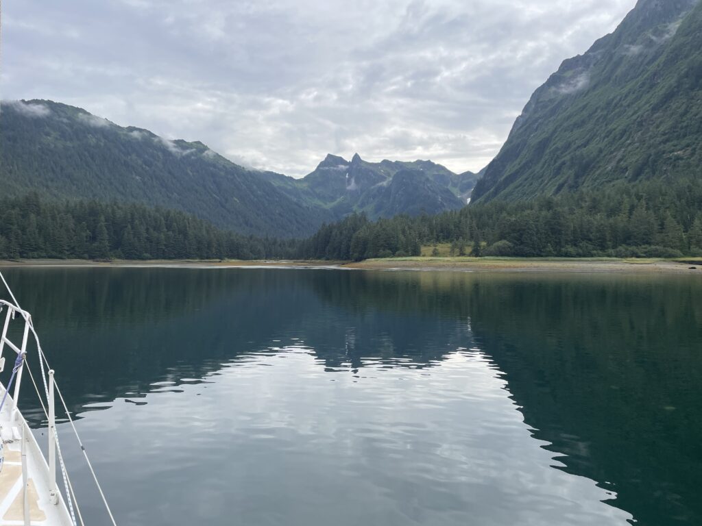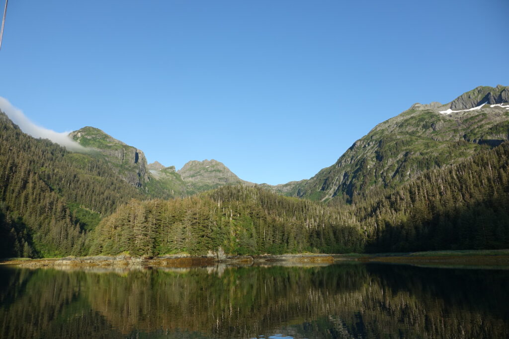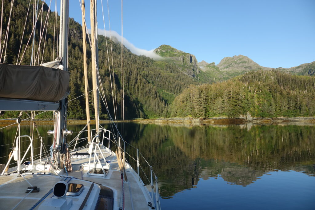 Sunday Harbor. Eh bien pour la première fois les cartes américaines sont mal renseignées. Heureusement, nous avons des photos satellites car une île constituée de rocs n’est pas mentionnée. Elle est mentionnée dans le coast-pilot comme étant couverte, or elle est visible et bien au-dessus de l’eau. Quel calme ici. Un autre voilier a choisi le même abri. Quelques oiseaux, quelques loutres. Une nuit sans une ride sur l’eau, nous n’avons pas bougé. Au matin sens inverse pour prendre vers l’est et sortir de la baie. Encore une grande journée de voile qui s’annonce. Il fait très beau contrairement aux 3 derniers jours mais je vous rassure même par temps gris et légère pluie l’Alaska est envoutant.