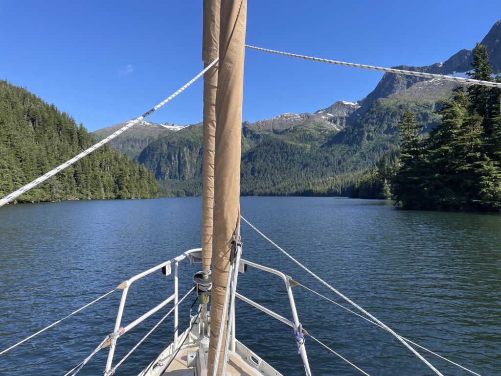 Mac Mullen Cove. Un chenal de 6mètres de profondeur contourne la corniche d’ardoise. Deux petits habitables déjà au mouillage, dans notre mouillage ! La Ghost-forest découverte avec BreakPoint il y a 7 ans, un peu plus verte grâce aux buissons qui s’y sont installés. Des peuplements d’arbres décolorés jonchent la rive sud-est. …. Très compliqué de mouiller car les fonds dans les vallées glaciaires sont très importants et il n’y a pas beaucoup de possibilités, même en changeant de zone. Nous jetons l’ancre par 27 mètres, pas très abrités mais la nuit devrait être calme. Nettoyage du saumon (48 cm), garder la tête pour pêcher la crevette, et enfin dîner. Bref à minuit bien sonné nous sommes couchés. Il pleut toujours mais calmement.