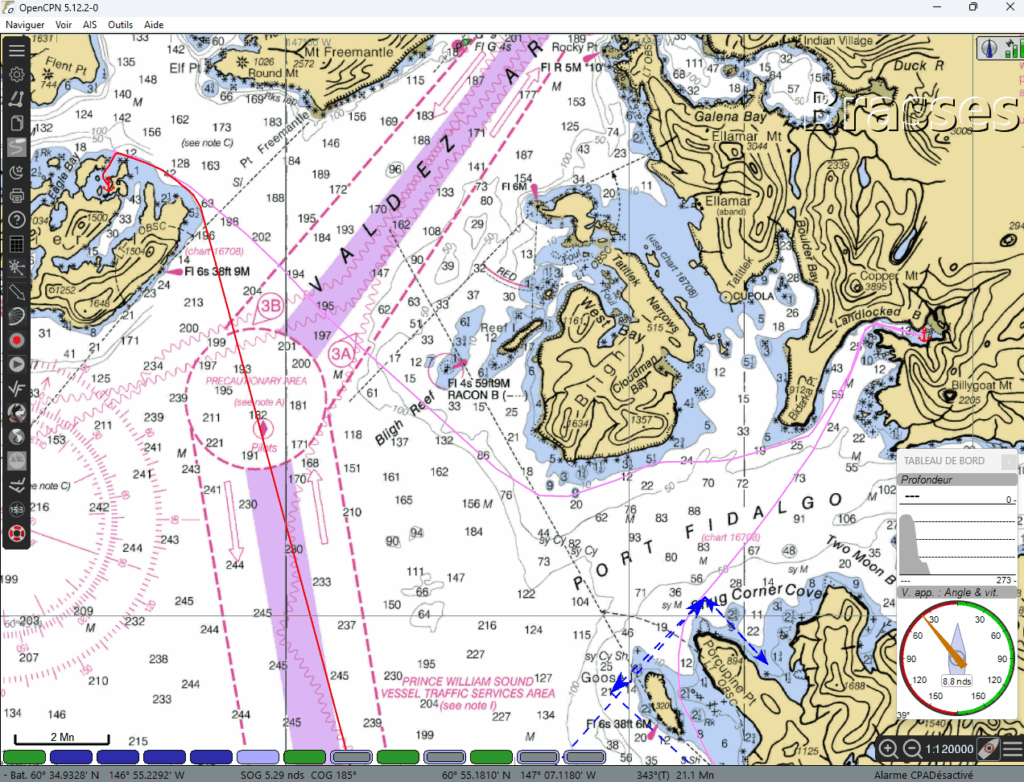 Ce rail a été instauré après la catastrophe de l’Exxon Valdez en 1989, lorsque le pétrolier l’Exxon descendant de Valdez s’est déchiré sur le Bligh Reef. (Au centre de la carte).