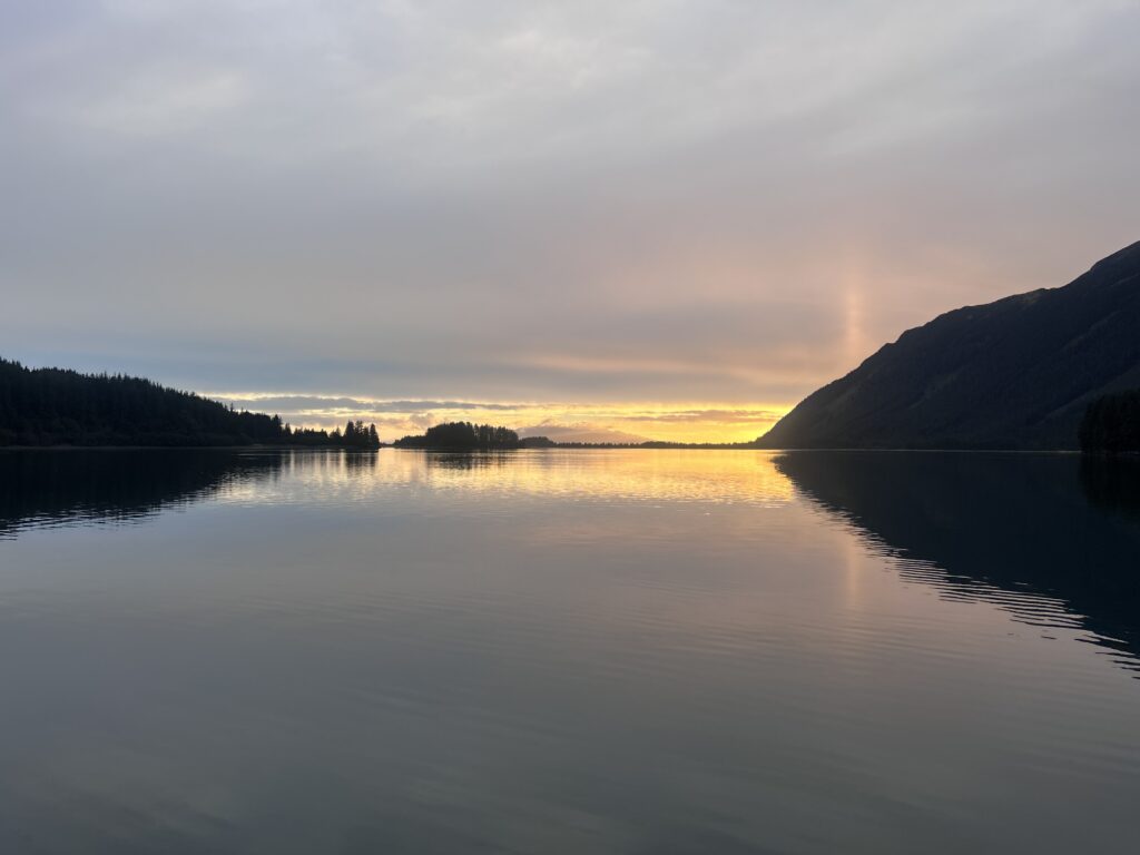La première baie à gauche en sortant. Deep Bay. Derrière une petite île. Nous profitons au maximum de cette journée : la lumière, le paysage, les reflets, les nuages qui s’effilochent sur les pans de montagnes, les loutres, les aigles… Les deux hommes partent en annexe. C’est sans doute la seule journée de beau temps qui nous est offerte avant longtemps. Une séquence pêche pour notre fiston, rien au bout de la ligne.